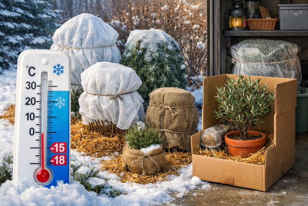 Leander, olajfa, füge, rozmaring esetén a –12 °C már kritikus, –20 °C pedig életveszélyes. Ha még kint vannak, MOST azonnal! Edényes növények: vidd be fagymentes, világos helyre. Szabadföldben lévők: vastag mulcs a gyökérhez, törzs köré szigetelés (hungarocell, karton), több réteg fátyolfólia + jutazsák. Extra trükk: Egy nagyobb kartondoboz belül szalmával bélelve sokat javít a túlélési esélyen.
